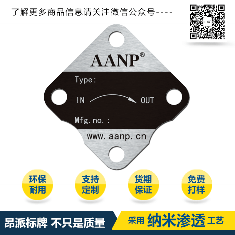 、銘牌、鋁牌的特色:特殊滲透印刷的金屬標牌,抗磨損性能較高,金屬標牌不僅擁有特殊印刷優(yōu)點,同時耐酸堿、