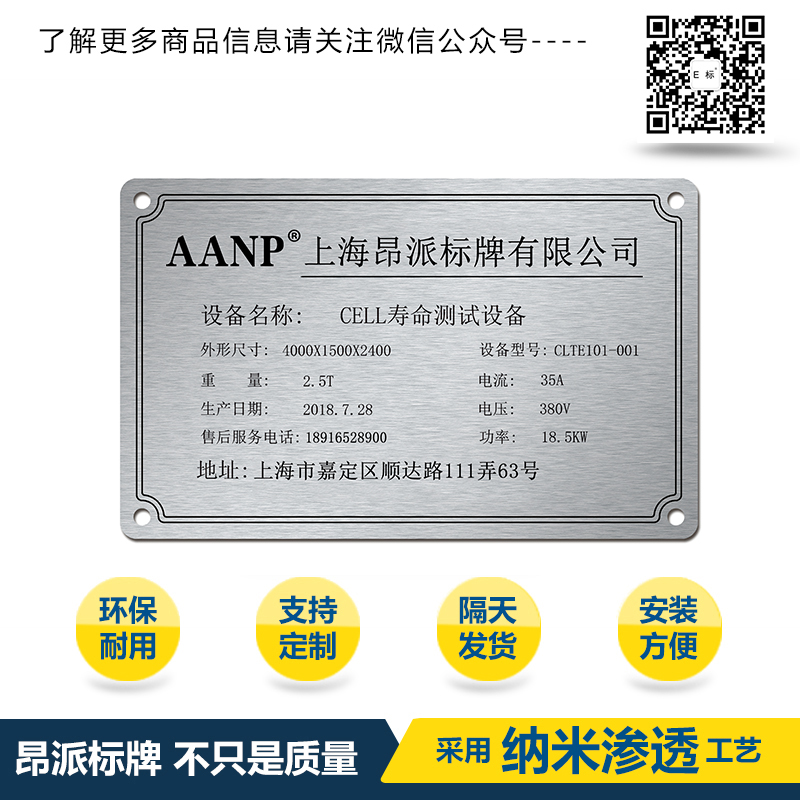 設(shè)備銘牌 時間:2018-09-10 13:47:18 分類:金屬銘牌 瀏覽:次 標牌、銘牌、鋁牌的品質(zhì): 本產(chǎn)品具有耐酸堿、耐熱震、耐高溫、抗沖擊、還具有很強的耐曬、耐磨擦、耐高溫、耐腐蝕、耐有機溶劑等特性,抗紫外線、抗粉化、不受臭氧、空氣污染、在室外陽光照射不易褪色,廣泛應(yīng)用于化工、電力和電信等腐蝕性強或須把標志牌懸掛于室外的企業(yè),歡迎新老客戶拿圖拿樣來定做.不分量大小都可以定做價格合理.質(zhì)量保證交貨準時。 分享收藏: 上一個: 英文標牌 下一個: 箭頭標牌 相關(guān)產(chǎn)品 陽極氧化指示小標牌 自動化設(shè)備鋁標牌 汽車零配件鋁標牌 陽極氧化指示標牌 電磁閥萬用鋁合金防偽標牌 電磁閥溢流閥標牌