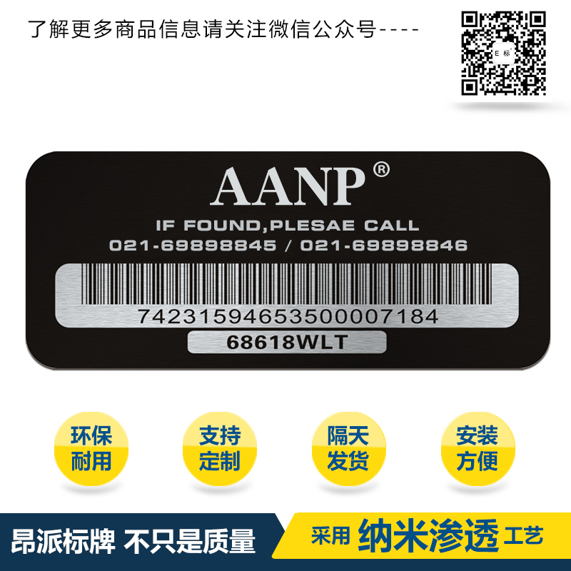 金屬條形碼牌 時(shí)間:2018-05-21 16:09:54 分類:金屬條碼 瀏覽:次 金屬條形碼采取德國(guó)納米滲透印刷工藝: 金屬二維碼---進(jìn)口鋁板---高科技德國(guó)滲透印刷技術(shù)---耐摩擦,耐溶劑,耐高溫,抗摩擦,耐紫外線,耐化學(xué)品性,耐腐蝕性,滲透印刷技術(shù)做出來(lái)的金屬二維碼使用壽命久,不易掉色,金屬二維碼識(shí)別率快,掃描識(shí)別率高。 分享收藏: 上一個(gè): 電網(wǎng)條碼銘牌 下一個(gè): 集團(tuán)條形碼 相關(guān)產(chǎn)品 感應(yīng)器鋁合金條形碼 工程系統(tǒng)管理使用金屬條形碼 物流管理鋁制條形碼 倉(cāng)庫(kù)管理鋁制條形碼 流水號(hào)鋁制條形碼 序列號(hào)鋁制條形碼
